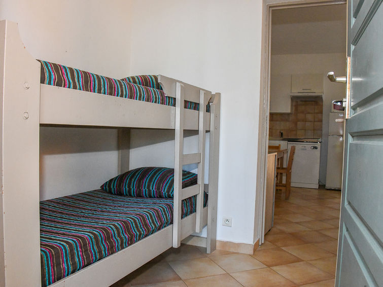"Studio cabine Type B", huis in een rij 1-kamer 24 m2. Het objekt is geschikt voor 2 volwassenen + 2 kinderen. Doelmatig ingericht: woon-/slaapkamer met 1 2-pers divanbed (140 cm, lengte 190 cm), 1 x 2 stapelbedden (90 cm, lengte 190 cm), TV (Flatscreen TV). Uitgang naar het terras. Kookhoek (afwasmachine, 2 keramische glas kookplaten, waterkoker, magnetron, elektrische koffiemachine). Bad/WC. Elektrische verwarming. Balkon, terras. Terrasmeubelen. Uitzicht op de tuin. Ter beschikking: Internet (WiFi). Maximaal 2 huisdieren/honden toegestaan. Rookmelders.